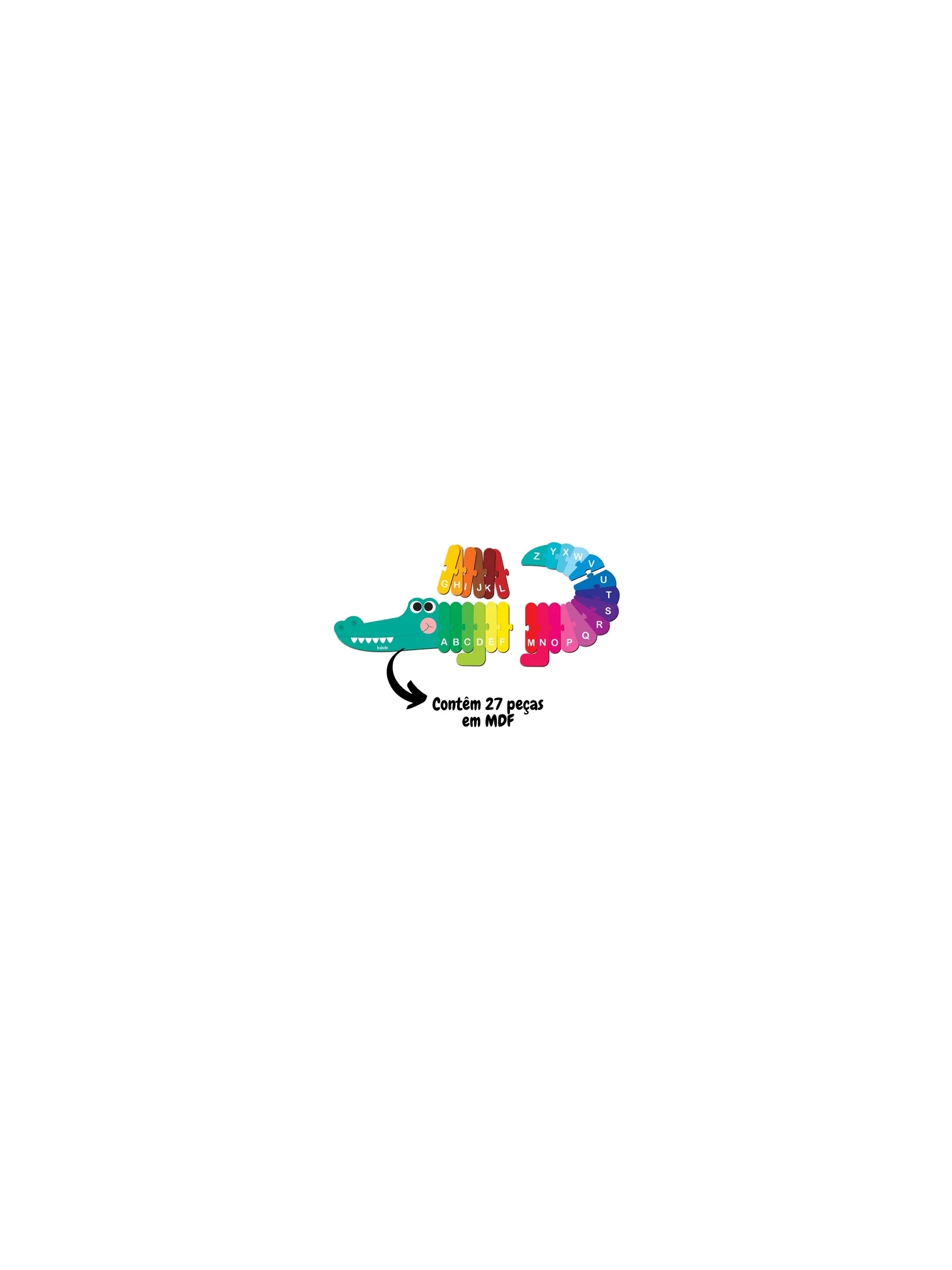 Contêm 1 quebra-cabeça medindo 70cm com 26 letras coloridas do alfabeto e 1 peça sendo a cabeça do jacaré.