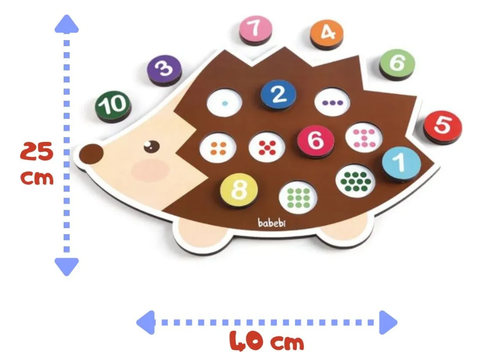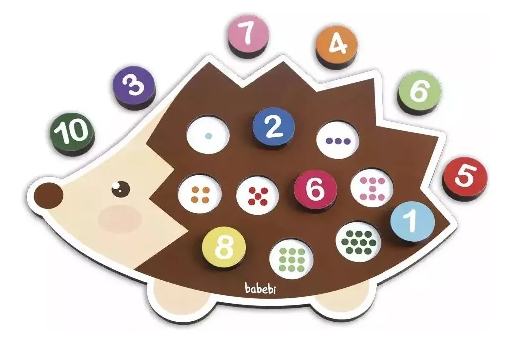 Aprenda a contar até 10 com este simpático ouriço. Com os botões que sinalizam os numerais e os orifícios, as quantidades, as crianças contam os pontinhos coloridos e associam as quantidades aos números de uma maneira muito divertida!