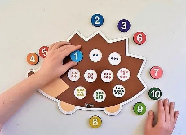 Quantos pontinhos temos aqui? um, dois, três e quatro! Aprenda a contar até 10 com esse simpático ouriço. Com os botões que sinalizam os numerais e no tabuleiro as quantidades, as crianças contam os pontinhos coloridos e associam as quantidades aos números de uma maneira muito divertida.