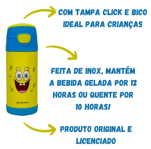 Com capacidade de 350ml, ela vai acompanhá-lo em todas as suas explorações na escolinha e nas brincadeiras mais malucas. Feita de aço inoxidável, essa garrafa é tão durável quanto o próprio Bob e mantém a bebida gelada por até 12 horas e quente por até 10 horas.