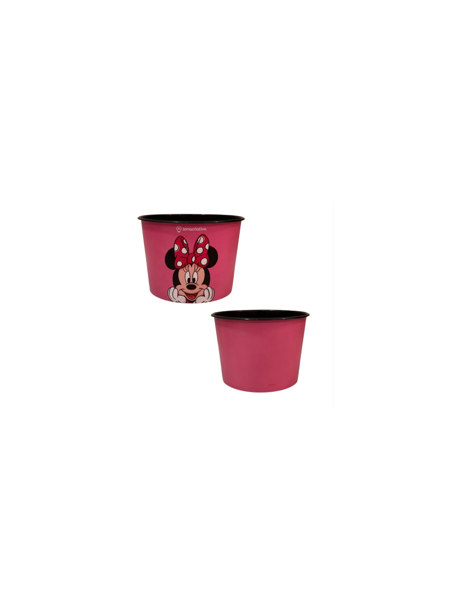 estampa é da Mouse e possui 400 ml, o balde é estampado da mesma maneira e possui 1,3 litros de capacidade.
