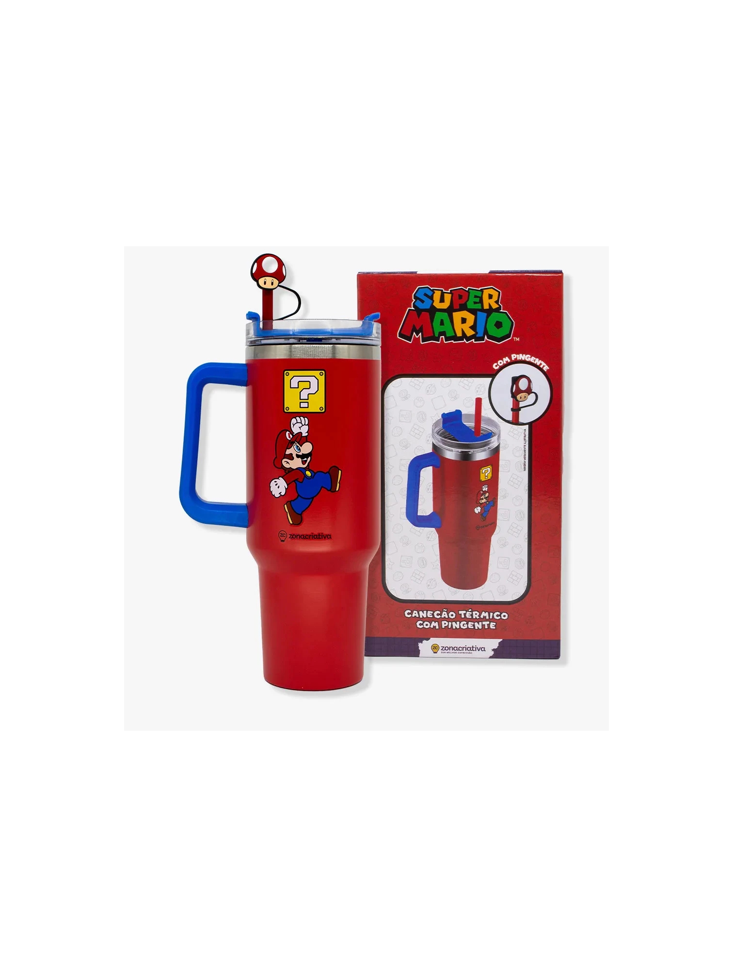 O produto é importado, feito em aço inox e plástico, possui detalhes incríveis que vão fazer você se apaixonar! Depois de um dia inteiro explorando novas fases, você precisa de uma mãozinha pra tomar aquele suco geladinho? A gente te ajuda! Com 1,15l de capacidade, um canudo com protetor e uma alça para carregar, esse copo é a companhia perfeita para o trabalho ou faculdade! Com uma tampa rosqueável, além de ser térmico, possui parede dupla que mantém sua bebida gelada por 12h e quente por 8h! Não importa se você é na pro player ou não, esse copo te acompanha em todos os seus games!