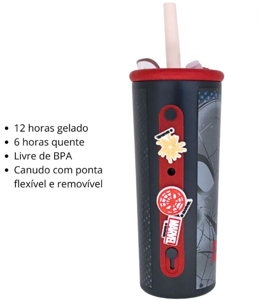 Esse copo é feito em aço inoxidável com detalhes em silicone e plástico PVC, e ajuda a manter bebidas geladas por até 12 horas e quentes por até 6 horas, tornando o uso ainda mais prático ao longo do dia. Conta com tampa, canudo removível e flexível, além da opção de beber diretamente no copo, oferecendo mais versatilidade em diferentes ocasiões. A alça removível facilita o transporte e os pins decorativos removíveis trazem um diferencial criativo que valoriza ainda mais o visual do produto. Também é livre de BPA, Disney Original e Marvel licenciado, sendo ideal para quem busca um copo térmico Spider Man bonito, funcional e cheio de atitude para usar ou presentear.